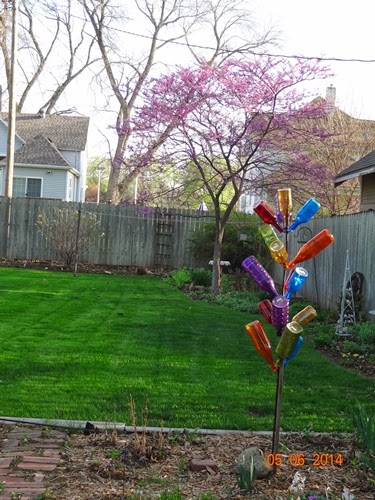 I am hoping that Spring has finally arrived and I want to enjoy it for a few weeks but today they have forcast the temp's to be in the 90"s..now how crazy can we get? I still have a few areas in the flower beds to get cleaned up but on Monday my oldest DD came down and "we" cleaned out all along the fence..Wow, what a big help that was and I am so grateful to have that done. I am in love with Spring so I wanted to show you a few pictures of my back yard. The bottle tree is new, I received it for Christmas from oldest DD & husband. I really like it!!